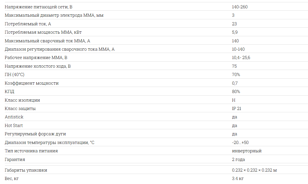 Сварочный аппарат РЕСАНТА САИ 140 является инверторным устройством, предназначенным для ручной дуговой сварки с использованием покрытых электродов. Этот аппарат отличается компактными размерами, удобством в эксплуатации и надежностью, что делает его отличным выбором для домашнего и полупрофессионального использования. Простой в настройке и эксплуатации, РЕСАНТА САИ 140 обеспечивает стабильную дугу и хорошее качество сварных швов. Его можно использовать для сварки различных металлов, включая сталь и чугун, и он идеально подходит для работ в строительстве, ремонте и монтажных работах.